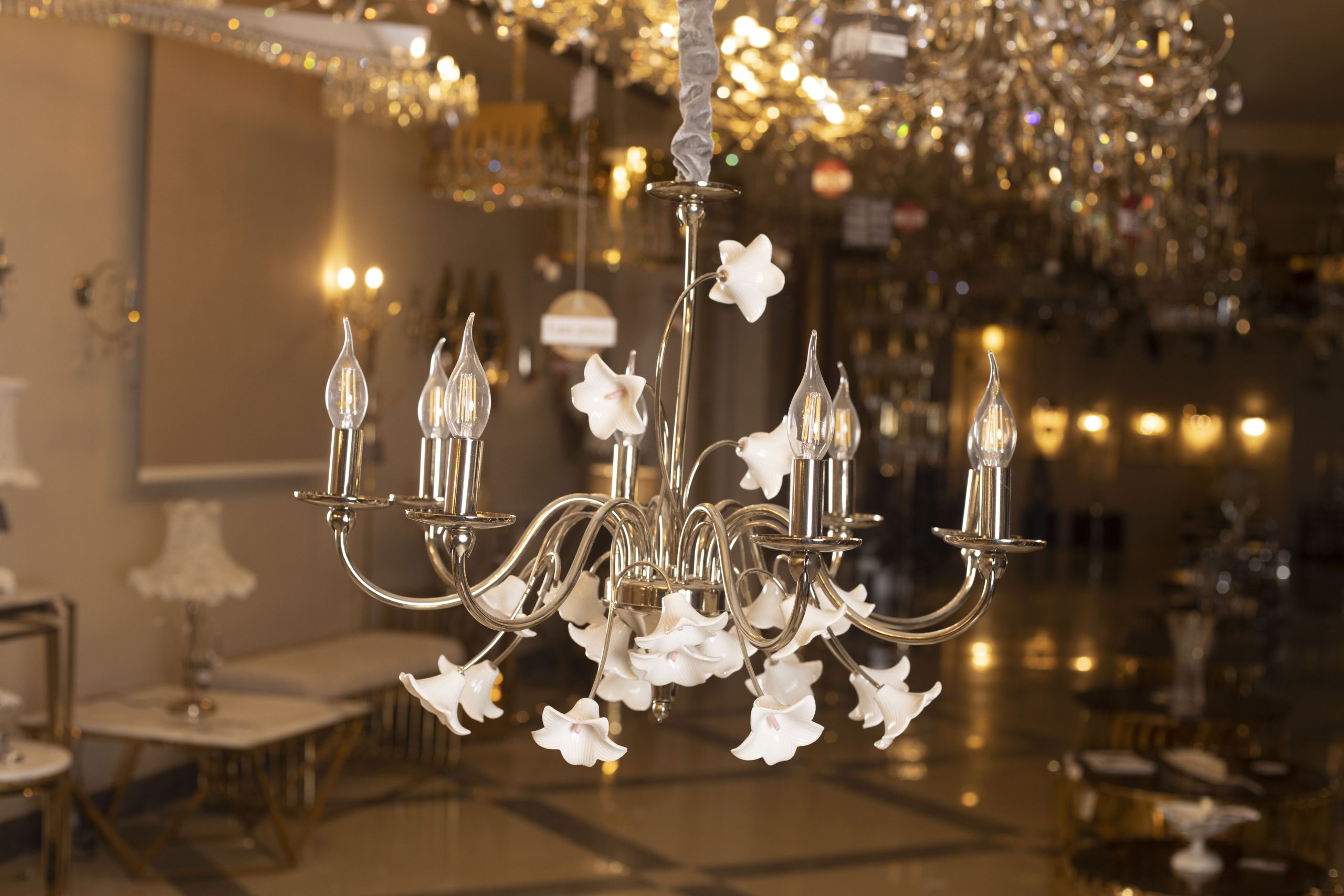 نجفة من ثمانية لمبة مزينة بورود من البورسلين، 4047، لون ذهبي سوليتير
