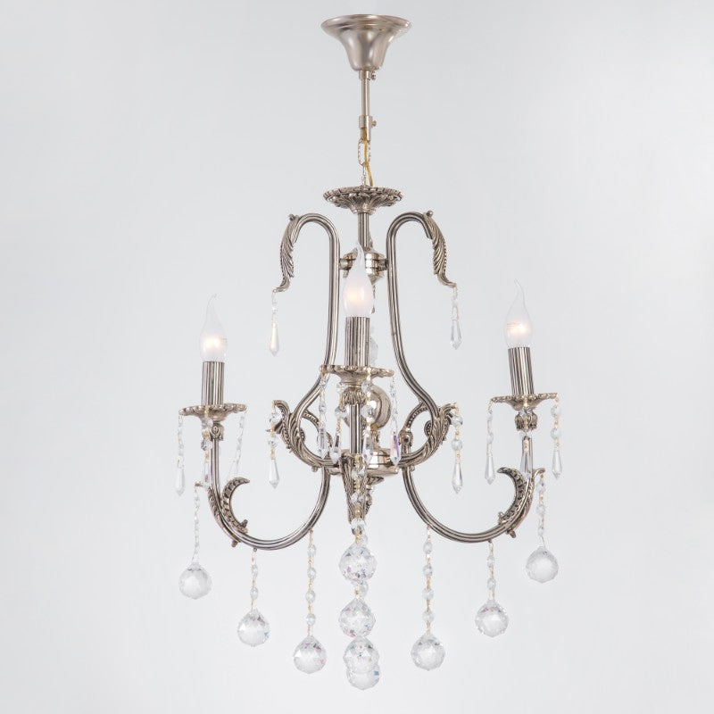 نجفة بثلاثة أذرع بتصميم كلاسيكي فاخر، مزودة بأجود أنواع الكريستال لإضفاء لمسة ملكية على منزلك.