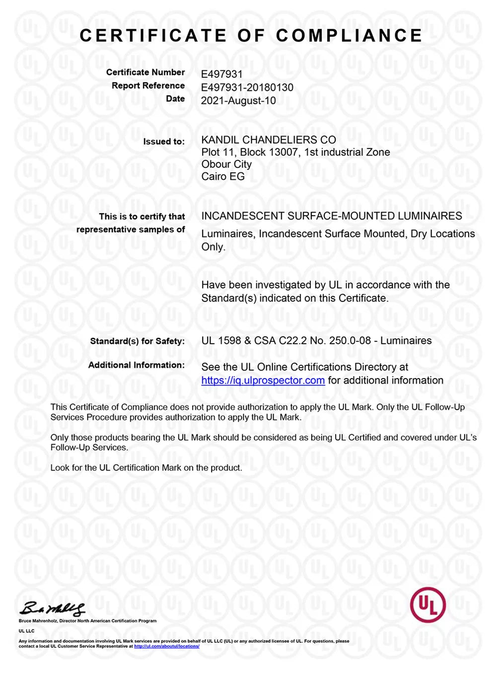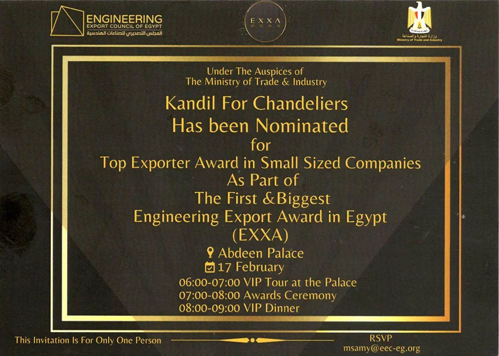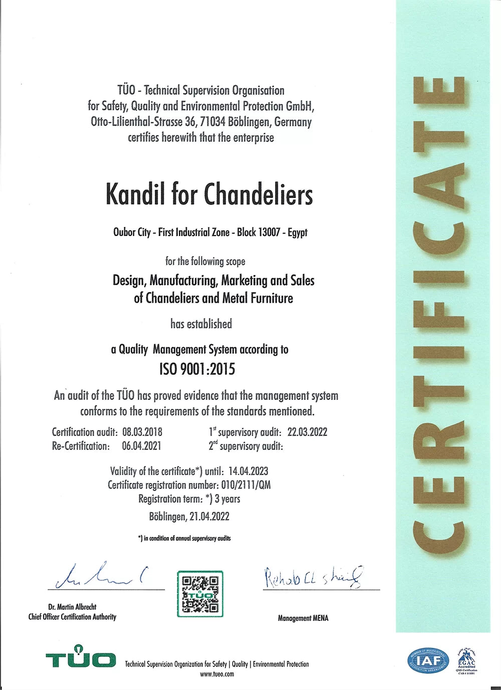 Kandil Egypt is the leading decorative lighting manufacturer in Egypt and the Middle East since it was established in 1976, as we were the first chandeliers manufacturer in Egypt.We have implemented many distinguished and giant projects all over Egypt and abroad.We also use the latest manufacturing and plating technologies in manufacturing all decorative lighting units.
